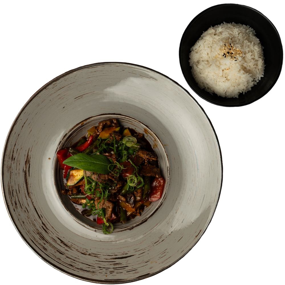 Wołowina podawane z orientalnymi warzywami, tajską bazylią i ryżem.