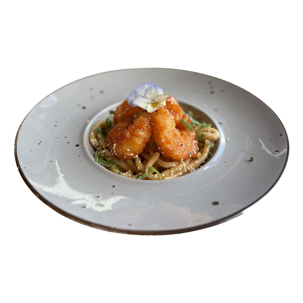 Makaron udon smażony na maśle z czosnkiem z krewetkami w tempurze, sosem chili honey, sezamem i szczypiorkiem.