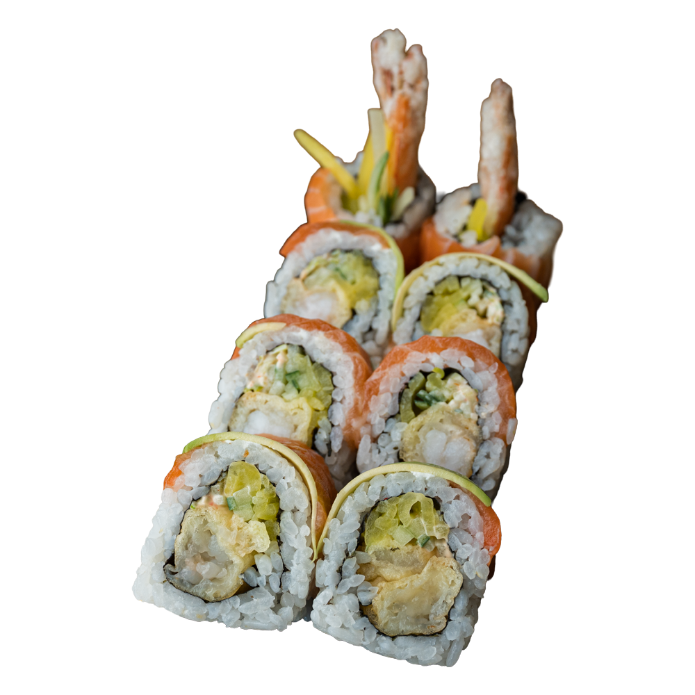 Krewetka w tempurze, spicy mayo, por, ogórek w środku; na zewnątrz łosoś, awokado i sezam