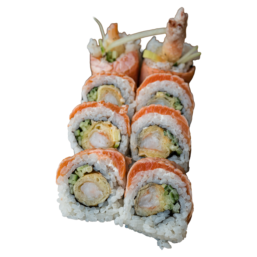 Krewetka w tempurze, spicy mayo, por, ogórek w środku; opiekany łosoś na zewnątrz