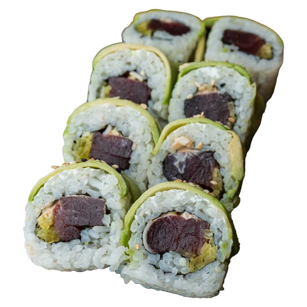 Tuńczyk surowy, spicy mayo, por, oshinko w środku; awokado na zewnątrz