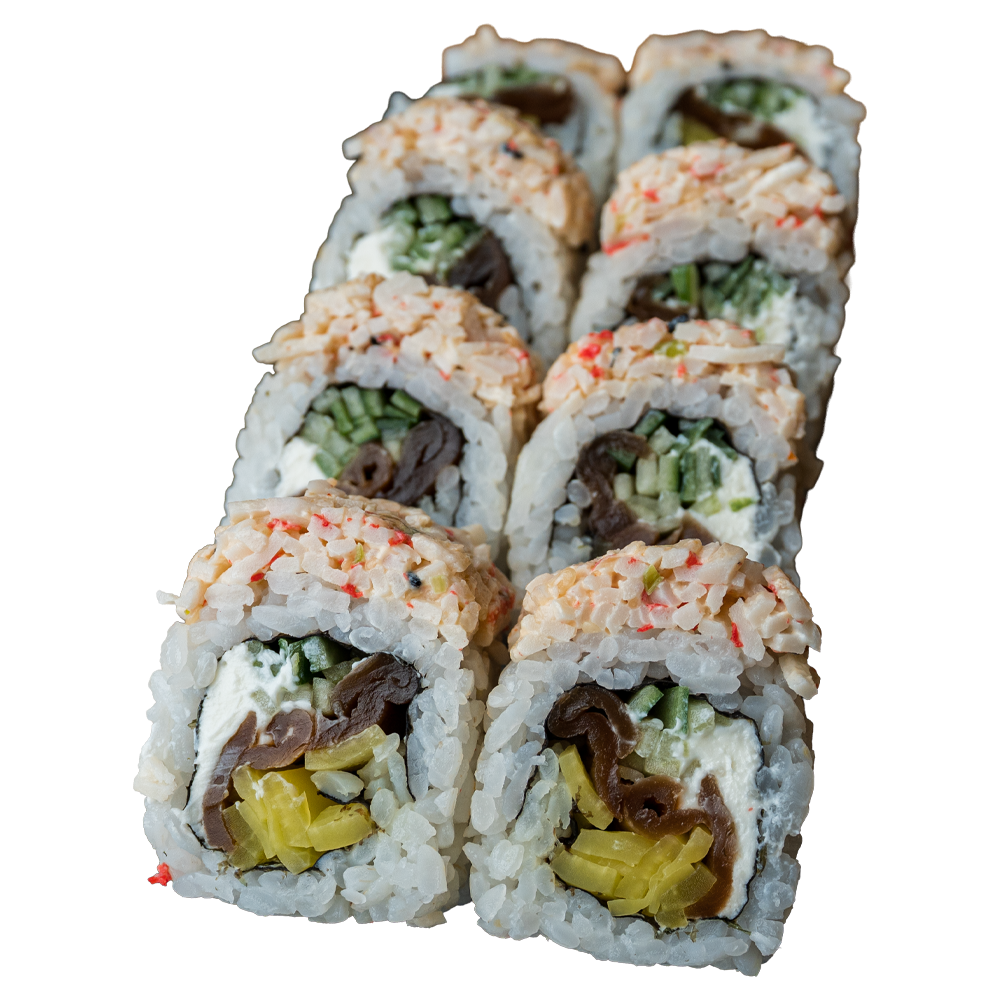 Warzywa w środku (ogórek, oshinko, kanpyo), serek; sałatka surimi na zewnątrz