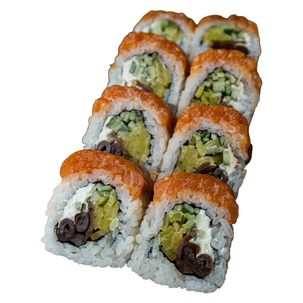 Warzywa w środku (ogórek, oshinko, kanpyo), serek; tatar z łososia na zewnątrz