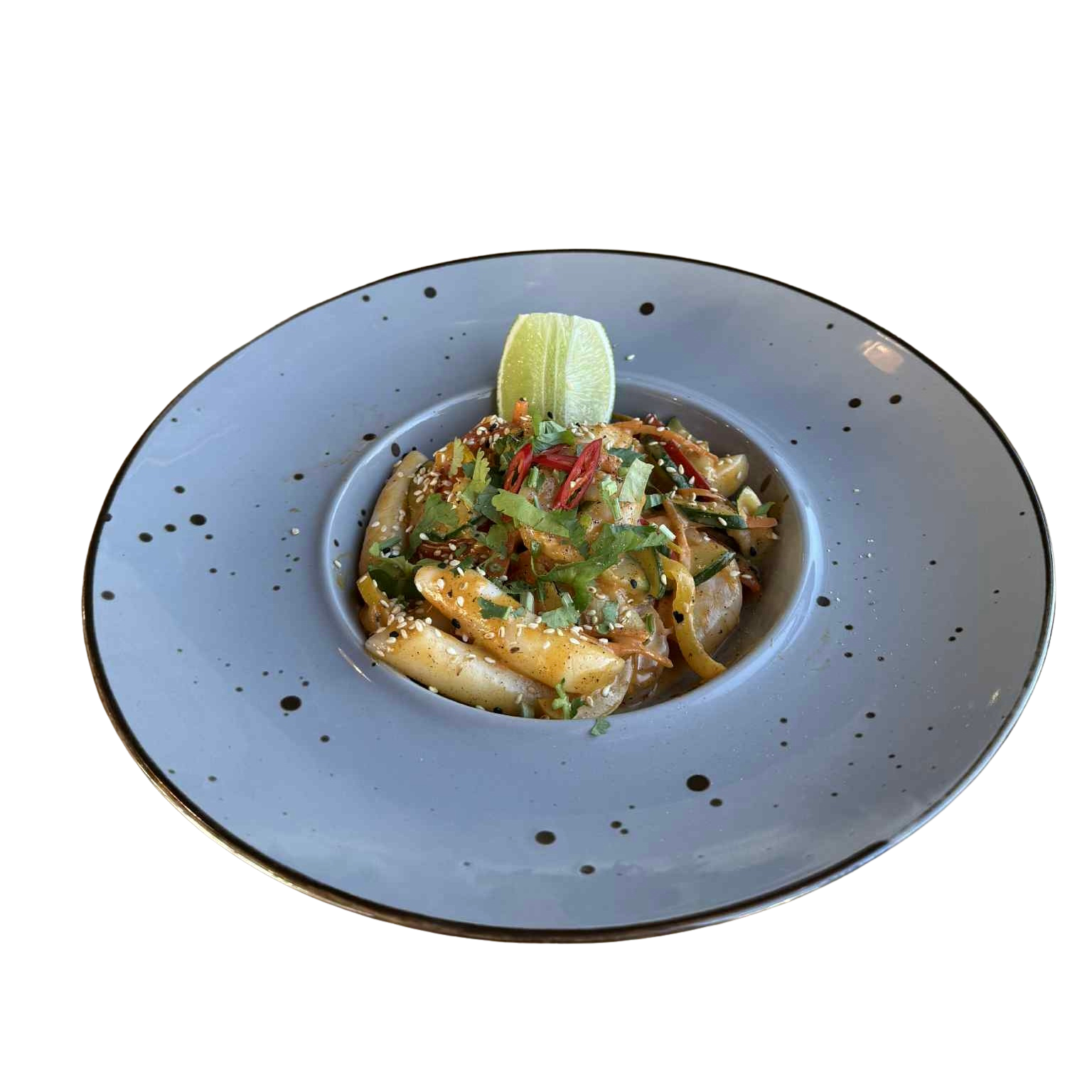 Kluski ryżowe w sosie curry na mleczku kokosowym podawane z cukinią, marchewką, papryką, limonką i kolendrą.