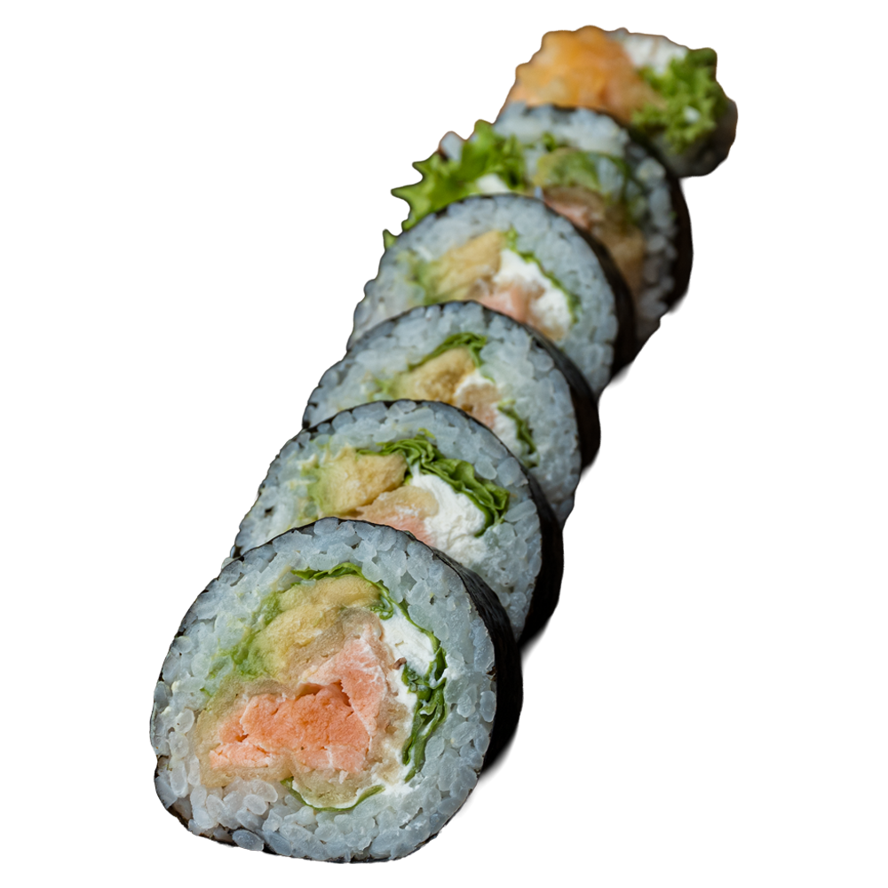 Łosoś w tempurze, serek, awokado, sos teriyaki, sezam