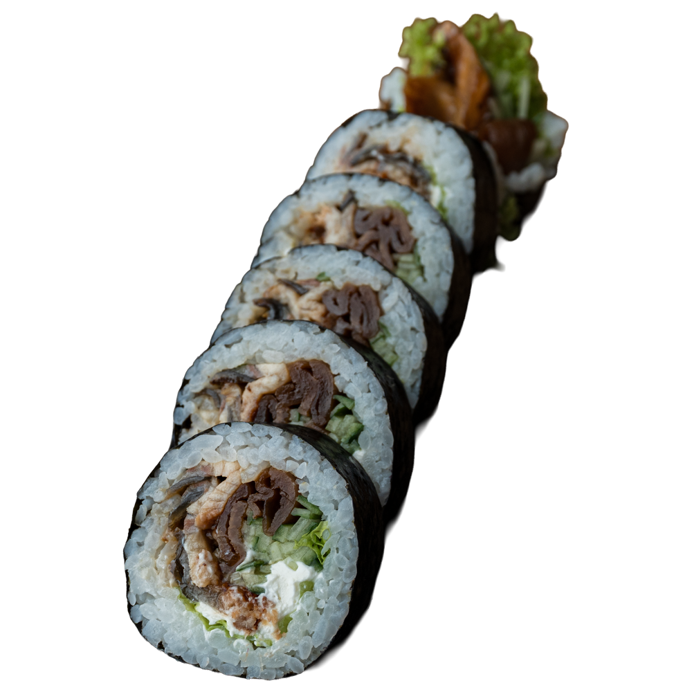 Węgorz pieczony, serek, ogórek, kanpyo, sezam, sos teriyaki