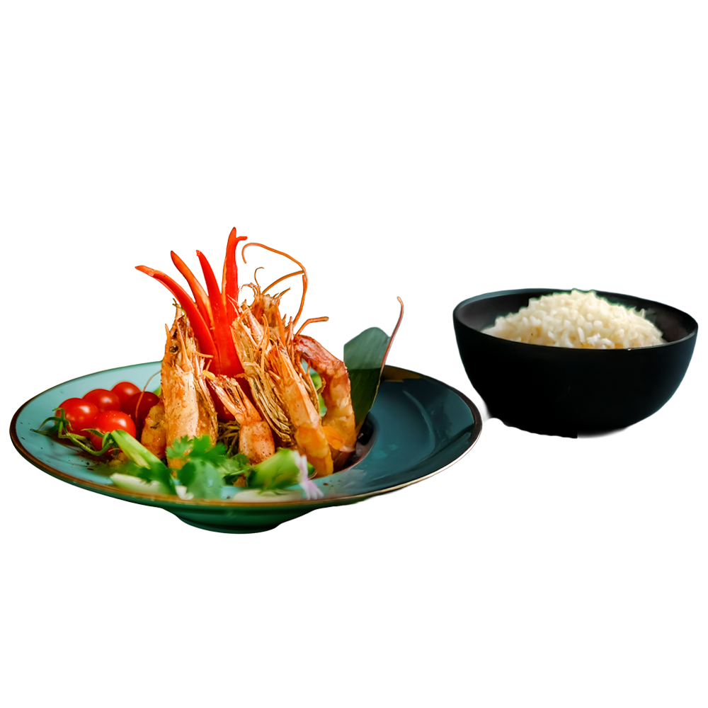 Krewetki królewskie smażone na maśle z czosnkiem, podawane ze świeżą sałatką i ryżem – 5 szt.