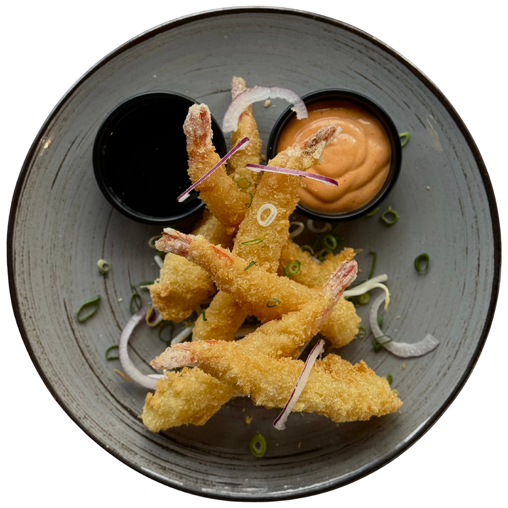 Krewetki (6 szt.) w chrupiącej tempurze serwowane z ostrym majonezem i sosem teriyaki.