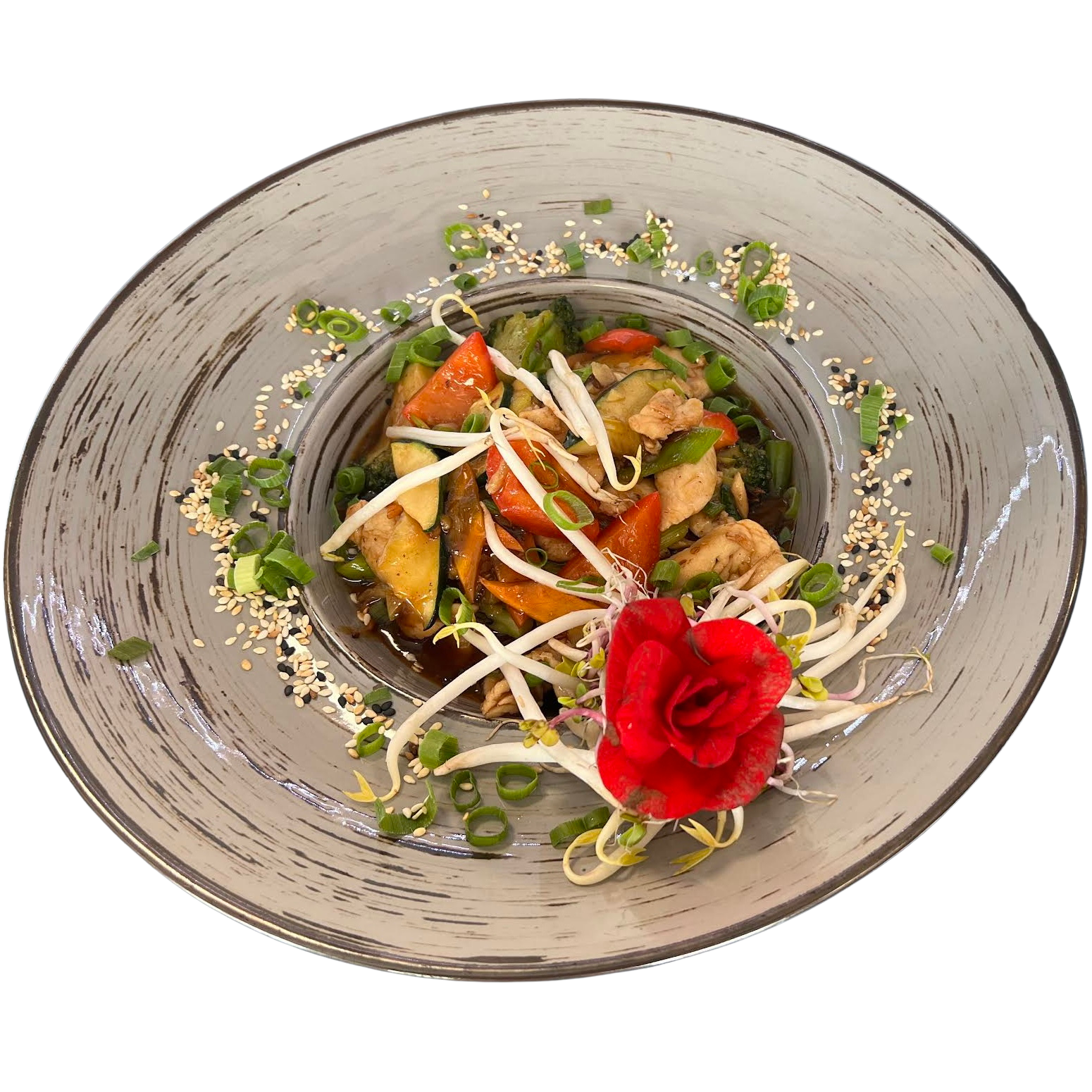 Smażony kurczak z warzywami w sosie słodko-ostrym, podawany z ryżem.