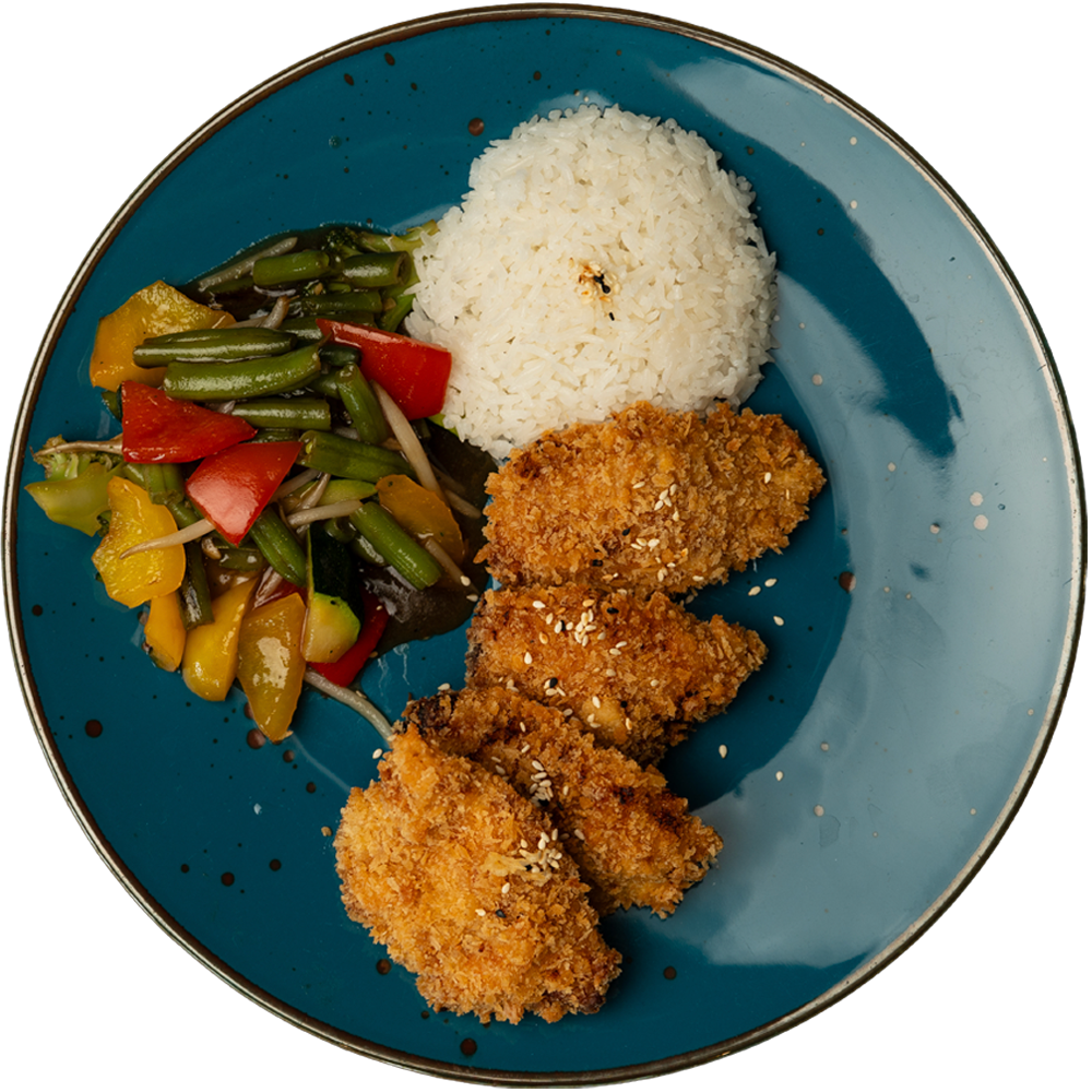 Smażone kawałki kurczaka w panierce panko podawane z ryżem i warzywami w sosie teriyaki.