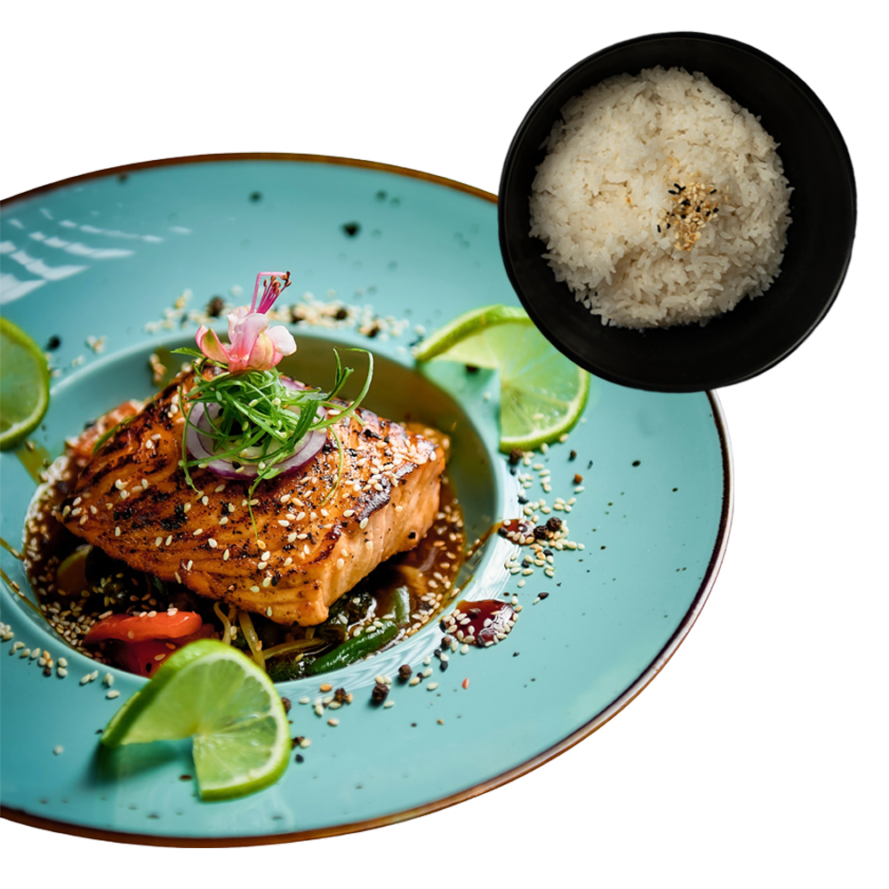 Łosoś z warzywami w sosie teriyaki podawany z ryżem.