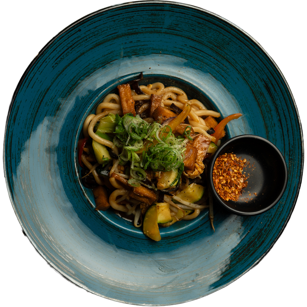 Makaron udon smażony z warzywami w sosie ostrygowym.