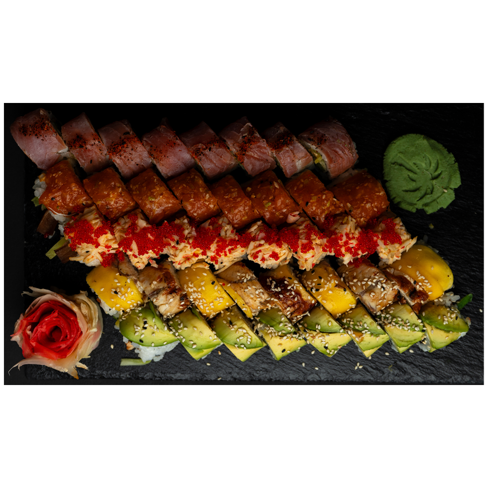 California gold z surowym łososiem, spicy mayo, ogórkiem i porem, owinięta węgorzem, mango, sezamem i sosem teriyaki – 8 szt.