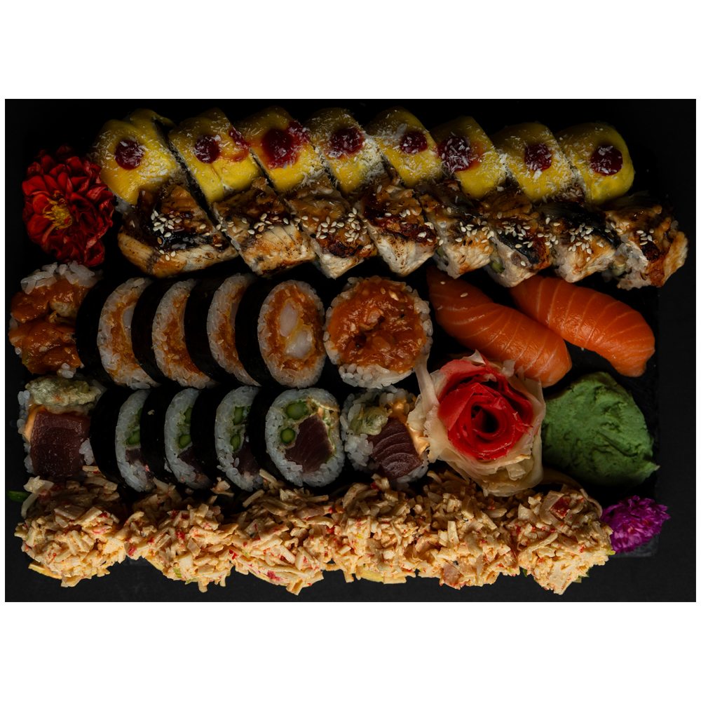 California gold z pieczonym łososiem, serkiem i kanpyo, owinięta mango z sosem malinowym i wiórkami kokosa – 8 szt.