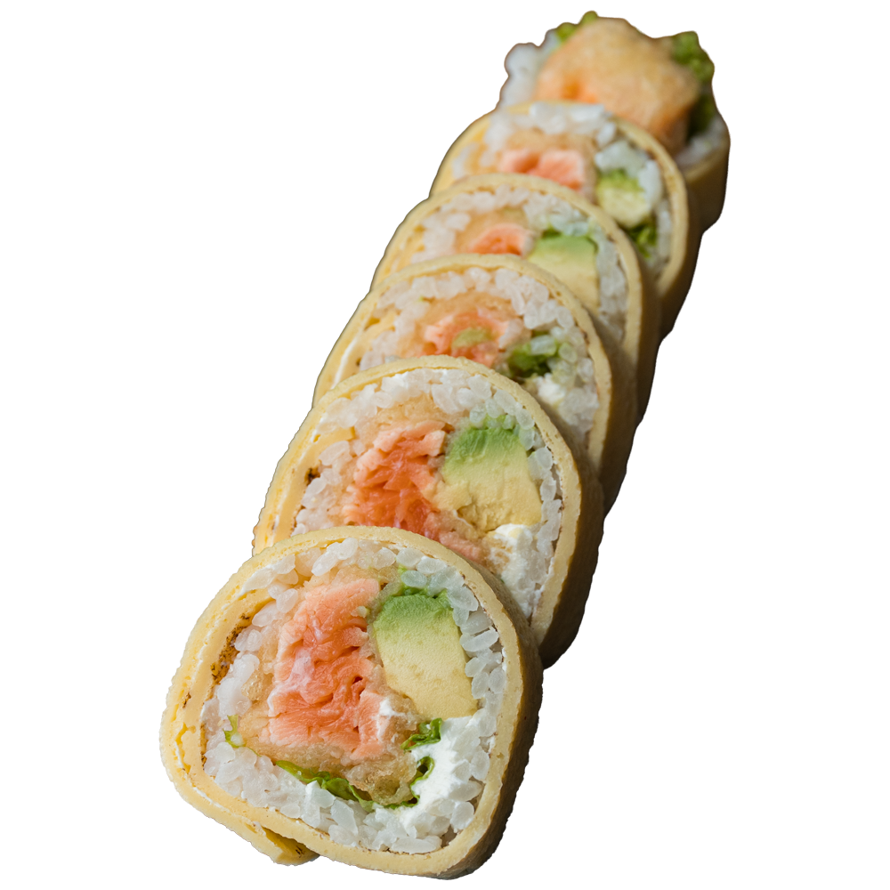 Łosoś w tempurze, serek, awokado, sos teriyaki, sezam