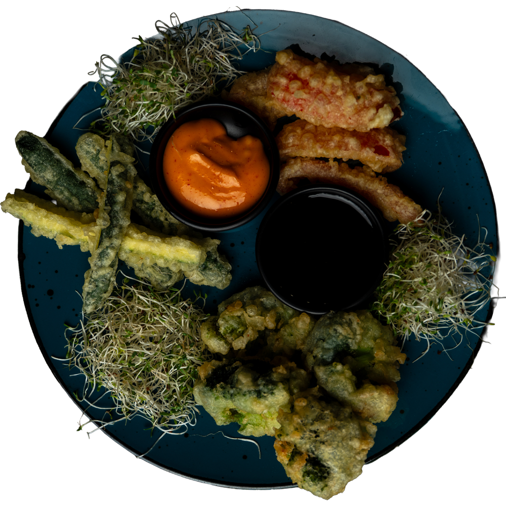 Warzywa w tempurze (cukinia, brokuł, papryka po 4 szt.) serwowane z ostrym majonezem i sosem teriyaki.